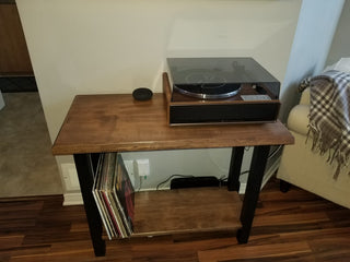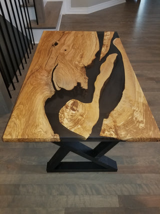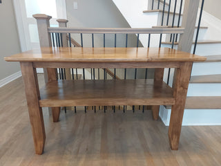 live edge maple console table with lower shelf. 28" h-frame metal legs.