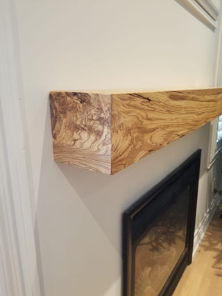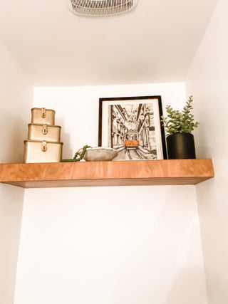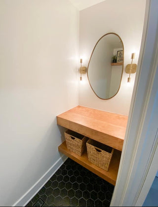 custom birch vanity top with waterfall edge, and matching floating shelves